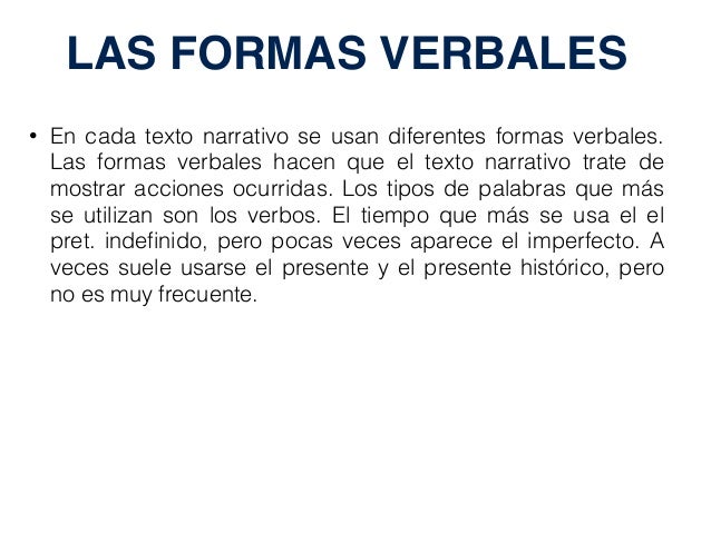 - • En cada texto narrativo se usan diferentes formas verbales. Las formas verbales hacen que el texto narrativo trate de mostrar acciones ocurridas. Los tipos de palabras que más se utilizan son los verbos. El tiempo que más se usa el el pret. indefinido, pero pocas veces aparece el imperfecto. A veces suele usarse el presente y el presente histórico, pero no es muy frecuente.