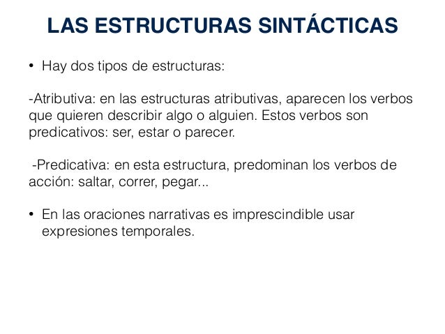 - • Hay dos tipos de estructuras: -Atributiva: en las estructuras atributivas, aparecen los verbos que quieren describir algo o alguien. Estos verbos son predicativos: ser, estar o parecer. -Predicativa: en esta estructura, predominan los verbos de acción: saltar, correr, pegar... • En las oraciones narrativas es imprescindible usar expresiones temporales.