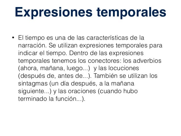 - • El tiempo es una de las características de la narración. Se utilizan expresiones temporales para indicar el tiempo. Dentro de las expresiones temporales tenemos los conectores: los adverbios (ahora, mañana, luego...) y las locuciones (después de, antes de...). También se utilizan los sintagmas (un día después, a la mañana siguiente...) y las oraciones (cuando hubo terminado la función...).